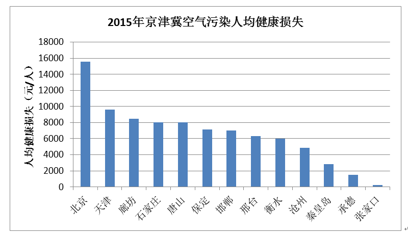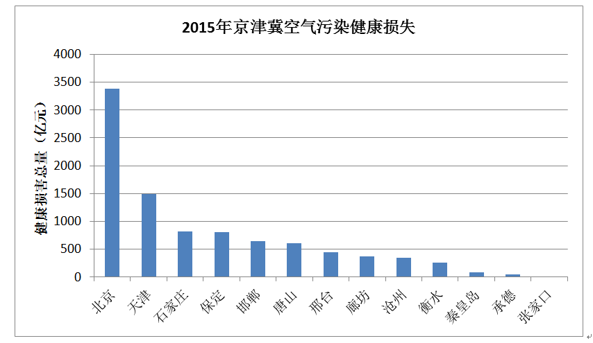 北京、天津因PM2.5超标所致健康损失总量最高,其次为石家庄、保定等城市,秦皇岛、承德和张家口因PM2.5超标所致健康损失总量最小。